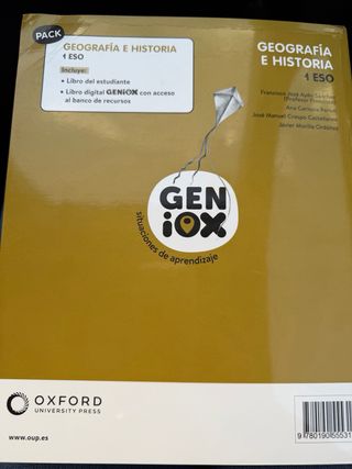libro de texto "GENiOX: Geografía e Historia" para 4º de ESO, publicado por Oxford Educación. Cubre temas de geografía e historia mundial, europea y española, así como temas actuales. Diseñado para fomentar una metodología práctica, incluyendo el uso de herramientas tecnológicas y el análisis de objetos de estudio. Sin anotaciones ni subrayados en el interior