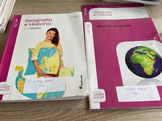 Pack Geografía e Historia 1º ESO Santillana ( atlas + cuadernillo) Precio 15€ (Negociable) Se pueden vender por separado. Se vende pack de Geografía e Historia 1º de la ESO (Santillana, Proyecto Construyendo Mundos): Libro principal de la asignatura Atlas 1º ESO Diario de aprendizaje (resumen + técnicas de estudio) 📚 Todo en muy buen estado, sin páginas rotas ni escritas. ✅ Perfecto para el próximo curso. 💰 Precio: 15€ (negociable) 📍 Entrega en mano en Fuenlabrada
