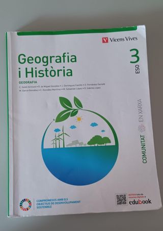 Libro de texto de Geografía e Historia para 3º de ESO de la editorial Vicens Vives. - Título: Geografia i Història - Nivel: 3 ESO - Editorial: Vicens Vives - Incluye contenido sobre Geografía. - Ilustrado con un círculo que representa el desarrollo sostenible.