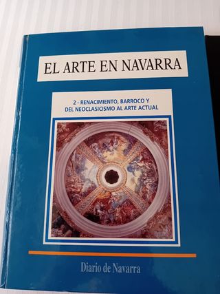 Se trata de una colección de libros de "Geografía de Navarra", "Historia de Navarra", "El Arte en Navarra" y "Etnografía de Navarra", publicados por Diario de Navarra. La colección incluye varios volúmenes sobre diferentes aspectos de la región. Los libros verdes se centran en la geografía, los amarillos en la historia, los azules en el arte y el rojo en la etnografía. Los textos de la imagen indican que los libros forman parte de una serie completa sobre Navarra.
