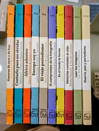 Lote de libros de la colección Voces de la Revista 5W. Algunos tienen marcas de uso, pero la mayoría ni se han leído. - Guerras de ayer y de hoy - Contarlo para no olvidar - África adentro - Europa soy yo - El viejo periodismo - El compromiso de la fotografía - En el fondo la forma - Historias contadas al oído - Leer las imágenes - Guerra, paz y periodismo