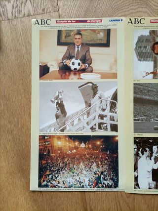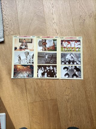 Láminas 1, 5 y 9 con los adhesivos 6, 25, 118, 94, 42, 86, 105, 1 y 84 del coleccionable de ABC de la historia de las 7 Copas de Europa del Real Madrid