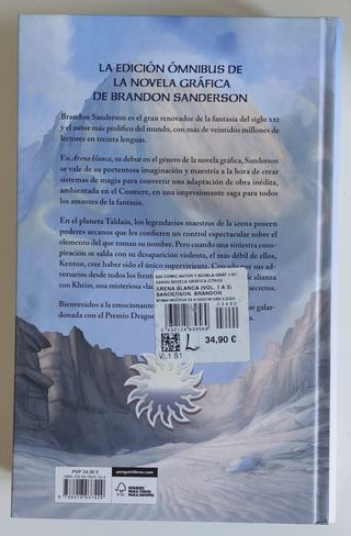 NOVELA GRÁFICA del Cosmere. ARENA BLANCA INTEGRAL. Nueva edición integral de Arena Blanca recopila los tres volúmenes originales en el universo del Cosmere. «Arena Blanca» es el primer proyecto de Brandon Sanderson. La historia transcurre en Taldain, un planeta que gira en rotación sincrónica con su sol, por lo que posee dos caras diferenciadas conocidas como Lado Oscuro y Lado Diurno. El libro está como nuevo, apenas se ha abierto. Número ISBN:9788418037429 Título: Arena Blanca. Una novela gráfica del Cosmere (volúmenes 1-3) Autor:Brandon Sanderson Editorial: Nova Formato: hardcover Idioma: spanish
