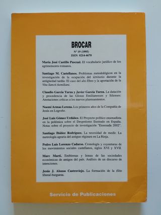 Libro Brocar. Cuadernos de Investigación histórica. Número 19; año 1995. Libro, universidad, facultad, historia. Edita Universidad de La Rioja; Servicio de publicaciones. Encuadernación tapa blanda o rústica. ISSN: 0214-4670. En perfecto estado; 2 primeras páginas rotas (ver foto).