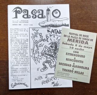 Copia del primer número del fanzine "Pásalo", de julio de 1994, una publicación informativa y punto de encuentro para los seguidores de Extremoduro. Se incluye copia del flyer del concierto de Extremoduro-Reincidentes- SA- Tirando Millas en Mérida de mayo de 1993 En este fanzine se podía comprar la doble cassette "Robe, mi pequeña historia" además de camisetas y material del grupo. Cuenta con una sección de noticias y agenda del grupo. 8 páginas medidas: 15,5 x 22 cm aprox