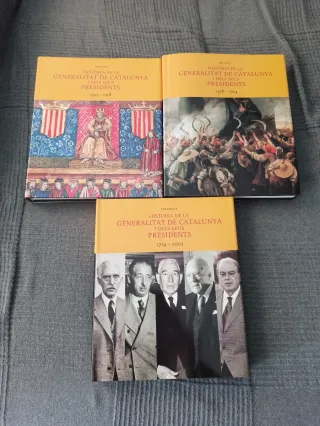 Historia de la Generalitat de Catalunya i els seus presidents Autor: Dirigida por Josep Maria Solé i Sabaté. Editorial: Publicada conjuntamente por Enciclopèdia Catalana y la Generalitat de Catalunya. Año de publicación: 2003. Idioma: Catalán. Formato: Tapa dura con sobrecubierta ilustrada. Contenido de los Volúmenes La obra completa de tres volúmenes cubre la historia de la institución desde sus inicios hasta principios del siglo XXI: Volumen I: Abarca el período de 1359 a 1518. Volumen II: Cubre los años de 1518 a 1714. Volumen III: Relata la historia desde 1714 hasta 2003.