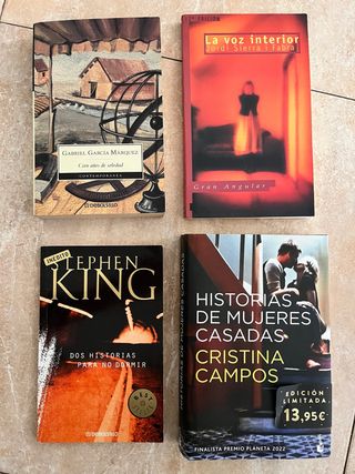 1- Cien años de soledad. Gabriel Garcia Marquez (tapa blanda) 2- La voz interior. Jordi Sierra Fabra (tapa blanda) 3- Dos historias para no dormir. Stephen King “inedito” (tapa blanda) 4- Historia de mujeres casadas. Cristina Campos “edición limitada” (tapa dura) 5- Cometas en el cielo. Khaled Hosseini (tapa blanda)