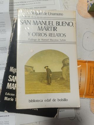 Miguel de Unamuno San Manuel bueno mártir y otros relatos prólogo de Manuel maceiras facian biblioteca edaf de bolsillo. Libro de primera edición de 1985 es un libro único ya que no hay ninguno en el mercado está algo pintado con lápiz pero el libro está forrado y bastante bueno uso