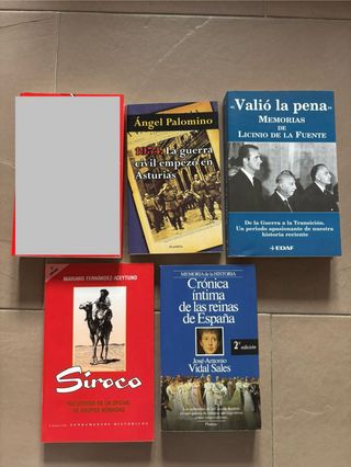 todos son de tapa blanda - 1934 la guerra civil empezó en Asturias. Angel Palomino. planeta ISBN 84-08-02346-2 - valió la pena memorias de Licinio de la Fuente. Edaf ISBN 84-414-0418-6 - siroco recuerdos de un oficial de grupos nómadas. mariano fernandez aceytuno. fundamentos históricos ISBN 84-85232-36-4 - crónica íntima de las reinas de España. José Antonio Vidal Sales. planeta ISBN 84-08-01002-6. cómo se ve en las fotos tiene tippex en la primera hoja por haber tapado el nombre Hago envíos combinados, puedes mirar mi perfil por si te interesa algo más y pongo todo en el mismo paquete en un único envío
