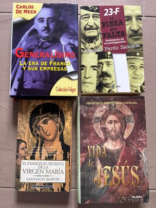 - tapa dura. generalisimo la era de franco y sus empresas. Carlos de Meer. colección fulgor ISBN 84-7378-042-6 - tapa blanda. 23-f la pieza que falta testimonio de un protagonista. Ricardo Pardo Zancada. plaza janes ISBN 84-01-39063-X - tapa blanda. el evangelio secreto de la virgen María. Santiago Martín.planeta testimonio ISBN 84-08-01911-2 - tapa dura. vida de Jesús. Francisco Fernández Carvajal. ediciones palabra ISBN 84-8239-000-7 Hago envíos combinados, puedes mirar mi perfil por si te interesa algo más y pongo todo en el mismo paquete en un único envío