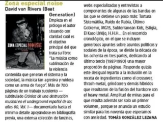 Crónica de una destrucción musical en el underground español de los años 80. Zona Especial Noise es un exhaustivo y ameno recorrido por la génesis y el desarrollo de estos estilos en el panorama subterráneo de nuestro país: desde los feroces prolegómenos del punk más salvaje hasta los años del hardcore utópico; a la aparición del controvertido thrash metal, los primeros rudimentos del death metal y los pioneros del grindcore. Con RIP, Attak, Frenopaticss, IV Reich, MG15, Anti/Dogmatikss, Tortura Sistemátika, HHH, Subterranean Kids, GRB, Último Gobierno, Ruido de Rabia, Máximo Volumen, Anestesia, Ac