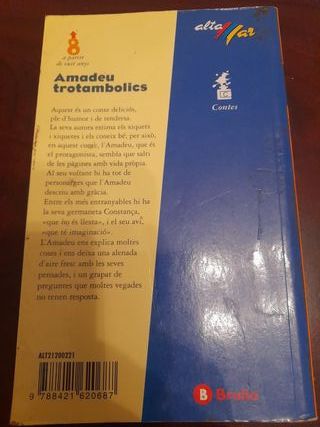 Libro infantil “Amadeu trotamòlics” de Lluïsa Mataix, publicado por Editorial Bruño. Cuento en catalán, recomendado a partir de 8 años, ideal para primeros lectores y para fomentar la lectura en lengua catalana. Historia divertida y entrañable, con lenguaje sencillo y mensaje educativo. Muy usado en ámbito escolar. Ejemplar usado, con señales normales del paso del tiempo en la cubierta (ver fotos), interior completo y legible. Ideal para: Niños y niñas Colegios y lectura escolar Familias que buscan libros en catalán