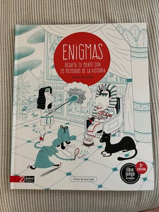 Libro de enigmas y acertijos, perfecto para pasar un buen rato resolviendo retos le lógica, pensamiento y creatividad.