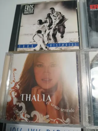 Lote de 7 CDs de música pop latina y romántica. - Incluye artistas como Eros Ramazzotti, Thalía, Shaila Dúrcal, José Luis Perales y Manuel Mijares. - Títulos visibles: Eros, Thalía el sexto sentido, José Luis Perales Quiero ser libre, Shaila Dúrcal Recordando, Manuel Mijares, Sabor a México José Luis Rodríguez El Puma. - Ideal para coleccionistas de música en español.