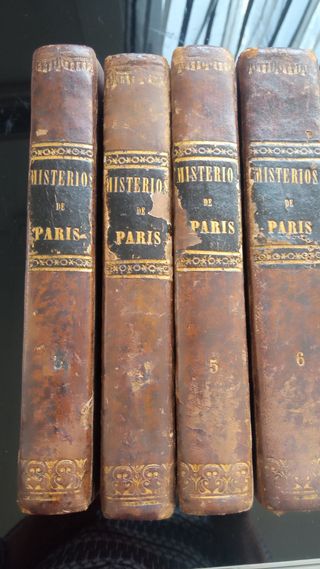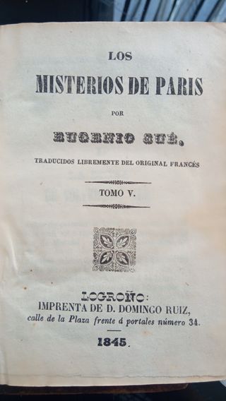 4 Tomos (3, 4, 5 y 6) de Los Misterios de París de Eugenio Sué. Editados en el año 1.845 en Logroño, en la Imprenta de D. Domingo Ruiz.