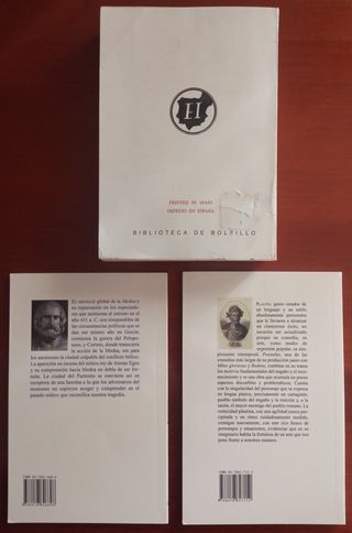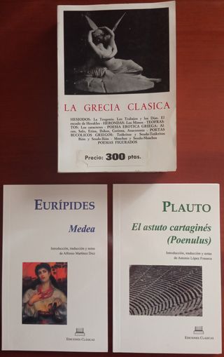 La Grecia clásica. ED. IBÉRICAS Contiene textos de: Hesiodos-Herondas-Teofrastos-Poesía erótica griega: Safo, Erina, Ibikos, Corinna, Anacreonte-Poetas bucólicos griegos: Teókritos... Ediciones Ibéricas, Madrid, 1969. 560 pp. 16,5x11,5 cm Tapa blanda, editorial. Traducción, noticias preliminares y notas de Juan B. Bergua. Presenta una rotura en la contraportada el resto muy buen estado. Plauto, El astuto cartaginés (Poenulus), Introducción, traducción y notas, Madrid, Ediciones Clásicas, 2010 ISBN 84-7882-669-6 corresponde a la edición de la tragedia griega Medea de Eurípides, publicada por la editorial Ediciones Clásicas.