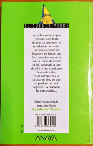 Colección El Duende Verde. Soledad, la profesora de lengua, está desesperada porque sus alumnos no se esfuerzan en clase. En un acto desesperado, les anuncia que, si no la detienen, asesinará a uno de ellos antes de que termine el día. Los alumnos, con sus vidas en juego, inician una búsqueda contrarreloj. Esta novela juvenil de Jordi Sierra i Fabra es una invitación a la lectura y al descubrimiento de grandes autores de la literatura universal, con referencias a obras como 'Historia de dos ciudades' y 'Los tres mosqueteros'.