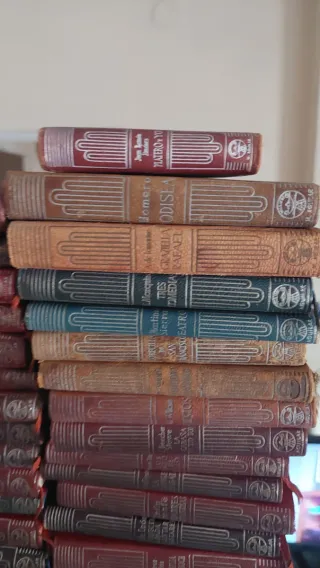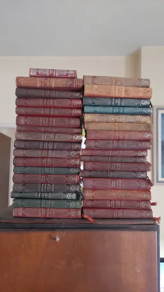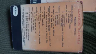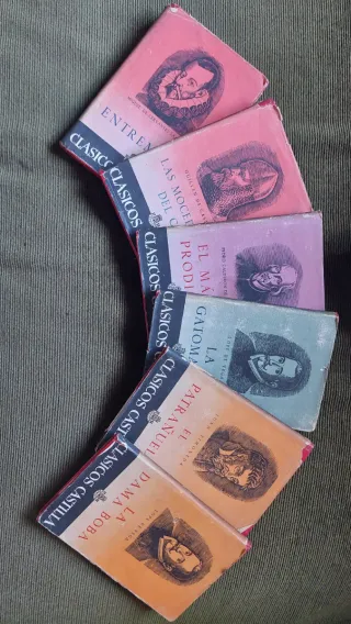 Estos libros son una colección vintage de la serie "Clásicos Castilla" de 1948. Autores incluidos: Miguel de Cervantes, Lope de Vega, Pedro Calderón de la Barca, Guillen de Castro y Juan Timoneda. Obras visibles: Entremeses de Cervantes, Las mocedades del Cid de Guillén de Castro, El mágico prodigioso de Calderón de la Barca, La dama boba y La gatomaquia de Lope de Vega, y El patrañuelo de Juan Timoneda. Características: Son ediciones antiguas con portadas ilustradas a color en tonos rojos, rosas y azules, característicos de esta serie literaria española.