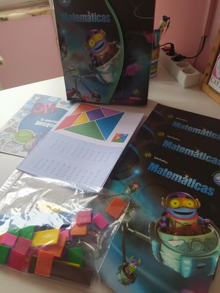 Libros de matemáticas de 4⁰ de primaria, editorial Edelvives en buen estado. Consta de 1 carpeta, 3 libros, 1 cómic, 6 troqueles, 1 juego para operar con fracciones.