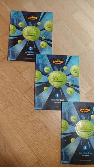 3 libros de matemáticas de tercero de primaria, correspondientes a los 3 trimestres.