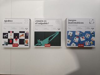 Se vende pack de tres bloques de juegos de ingenio de la editorial ALMA. Son ediciones prácticas con láminas extraíbles, ideales para ejercitar la mente o entretenerse en ratos libres. El lote incluye: - Ajedrez: Problemas técnicos y tácticos (mates, ataques dobles, etc.). - ¿Quién es el culpable?: Enigmas de intriga y suspense para resolver. - Juegos matemáticos: Acertijos numéricos y de lógica visual. Estado: Los libros están en buen estado de conservación. Han sido utilizados pero se mantienen bien cuidados, sin rayones ni roturas que afecten a la lectura de los desafíos.