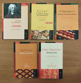 - Linneo: el príncipe de los botánicos. Antonio González Bueno. Nivola (Científicos para la historia: series mayor, 6). 9788492493234. Tapa blanda. - Euler: el maestro de todos los matemáticos. William Dunham. Nivola (6). 9788493071967. Tapa blanda. - Fibonacci: el primer matemático medieval. Ricardo Moreno Castillo. Nivola (18). 9788495599827. Tapa blanda. - Emmy Noether: matemática ideal. David Blanco Laserna. Nivola (22). 9788495599933. Tapa blanda. - Ruffini: popular y desconocido. Vicente Meavilla Segui. Nivola (26). 9788496566095. Tapa blanda. - Pascal: un genio precoz. Félix García Merayo. Nivola (33). 9788496566460.