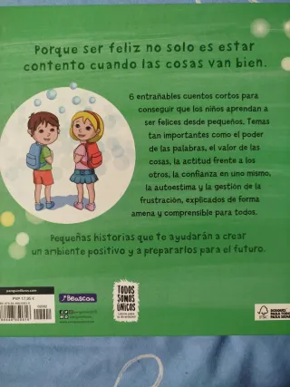 Libro totalmente nuevo sin estrenar, de 6 entrañables cuentos cortos para conseguir que los niños aprendan a ser felices desde pequeños. Temas tan importantes como el poder de las palabras, el valor de las cosas, la actitud frente a los otros, la confianza en uno mismo, la autoestima y la gestión de la frustración, explicados de forma amena y comprensible para todos.