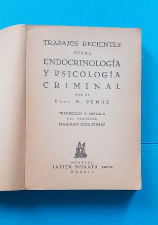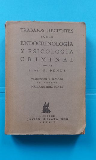 Trabajos recientes sobre endocrinología y psicología criminal por el Prf. N. Pende. Traducción y prólogo del prf. Mariano Ruiz Funes Madrid. Morata. 1932. 314 páginas. Estado aceptable con algún deterioro por el uso. Ver fotos