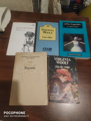 2€ cada uno Anuchka - Ivan Turgeniev VENDIDO Las olas - Virginia Woolf Fin de viaje - Virginia Woolf VENDIDO Las virgenes suicidas - Jeffrey Eugenides VENDIDO Rayuela - Julio Cortázar El asno de oro - Apuleyo Libro de apolonio La medicina china - Pierre Huard, Ming Wong Hija del tibet - Rinchen Dolma Taring VENDIDO La revolucion del silencio - Consuelo Martin (subrayado y alguna anotación) VENDIDO 99 cartas a kafka - Cristina Gufé VENDIDO Sobre la tumba del poema - Leopoldo Maria Panero Sonetos de amor - Wiliam Shakespeare Las flores del mal - Baudelaire La destrucción o el amor - Vicente Aleixandre Tiziano- Colección pintores
