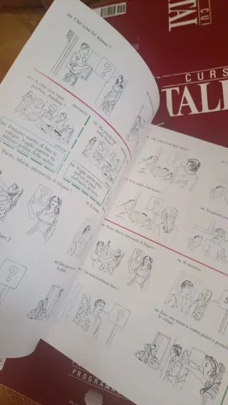 10 cassettes. 9 fascículos y una carpeta de tela. Conjunto de materiales para el curso de italiano.