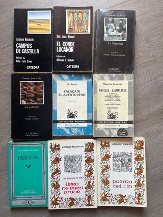 Se venden juntos o por separado. Precio según tipo y número - La celestina. Fernando de Rojas - La colmena. Cela - El conde Lucanor. Don Juan Manuel -Zalacaín el aventurero. Baroja -Novelas ejemplares. Cervantes -fábulas. Samaniego -El libro del buen amor. Arcipreste de Hita -poema del Cid -El hereje. Delibes -3 novelas del siglo de oro (lazarillo de Tormes, la vida del buscón,Quevedo, el diablo cojuelo,Vélez de Guevara) -La divina comedia. Dante -Retablo jovial. Casona -El Jarama. Sánchez Ferlosio -diario de Ana Frank -Madame Bovary. Flaubert -Piezas breves. Pirandelo -Escuadra hacia la muerte. Sastre -Conjuración de Catilina Etc