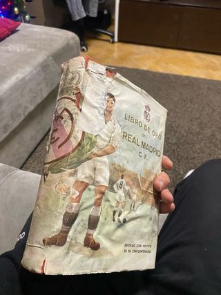 Libro de oro del real Madrid editado en su 50 aniversario Debido a los años del libro presenta los desperfectos que se ven en las fotos pero su interior esta al 99% perfecto Se puede ver en las fotos las reseñas de quel tiempo.