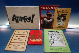 Lote de seis libros diferentes tamaños y editoriales, Aragón. Los libros son las fiestas de mi lugar, El dance aragonés, el Castillo de San Pedro de Jaca, Galdós y Aragón, Aragón conmemoración de las bodas de oro de Octavio y felez, la portada con las letras en relieve. El precio es por todo y el lote no se divide. 2492 a1
