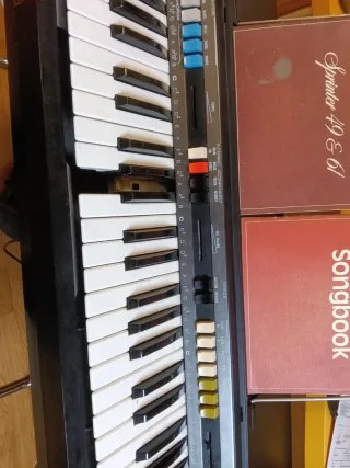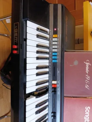 Teclado electrónico vintage Sprinter 49 de la marca GEM. Diseño retro (80's). - Modelo Sprinter 49. - Marca GEM. - Incluye funciones de ritmo y acompañamiento automático. - Incluye Manual de instrucciones y libre de partituras - Tecla Mi (A) debajo del Touch rota (no se arreglarla) - Varillas de Tempo y Acc. volume también rotas