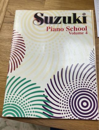 Libro de piano, método Suzuki, volumen 4. - Cubierta con diseño de círculos y abanicos. - Texto en inglés.