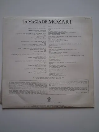 Disco de vinilo con La Magia de Mozart. - Obertura de Il Impresario - Concierto para piano nº 21 (Elvira Madigan) - Divertimento nº 17 - Marcha turca - Andante para flauta y orquesta - Concierto para fagot - Sinfonía nº 40 - Misa de la Coronación - Concierto para 2 pianos - Cuarteto La caza - Sinfonía Júpiter - Quinteto para clarinete - Serenata Posthorn - Exsultate, Jubilate Más música en mi perfil, CDs, vinilos, libros