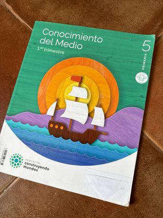 Conocimiento del Medio 5º Primaria — Construyendo Mundos — Santillana — edición 2022 — Mochila ligera — castellano ISBN-13: 978-84-680-7294-4. Libros de texto de quinto de primaria, conocimiento del medio primer y tercer trimestre y diario de aprendizaje. Se venden a 5€ euros cada uno. Sin marcas, excepto por las páginas que aparecen en la fotografía y dos mas.