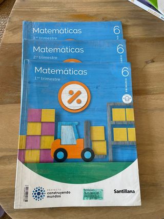 Tres libros de texto de matemáticas de sexto de primaria separados por trimestres para mayor comodidad y así llevar menos peso