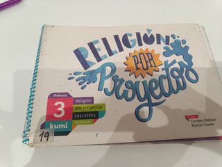 Libro de Religión segundo primaria Revuela SM Andalucía. Está casi sin tocar, sólo escrito en 2 páginas (ver fotos) con lápiz, creo que se podría borrar. Los recordables del final están sin tocar. A parte de esas 2 páginas escritas, está impecable.
