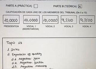 Vendo temario de oposiciones de secundaria inglés. No están los 69 temas, sino los 58 que no están tachados en la segunda foto. Resumidos y anotados a lápiz, con ideas útiles para el examen del tema, común a todas las comunidades autónomas. Estos temas me permitieron sacar una nota superior a 8 en tres comunidades en las oposiciones de este año 2025 y sacar plaza en dos de ellas, tal y como se puede apreciar en las fotos finales. Temario en físico, encuadernado, 150€ Precio por tema 4€, con descuento por lote. En versión digital, 70€ Resúmenes de esos temas disponibles (foto 5). Ante cualquier pregunta, ino dudes en contactarme!