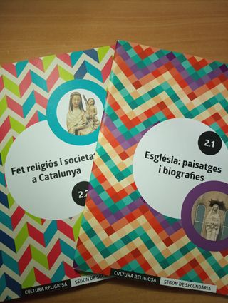 Dos libros de religión en catalán. Los libros por separado están a 5€. El primero es: Església: Paisatges i biografies 2.1 y el segundo Fet religiós i societat a Catalunya 2.2