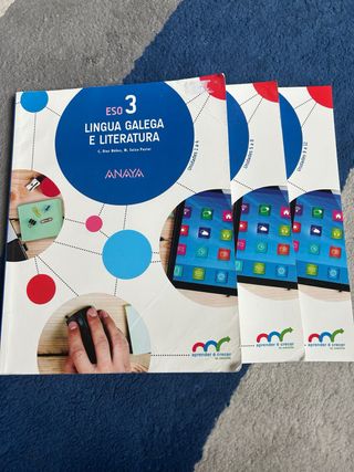 3 libros de Lingua Galega e Literatura de 4 ESO, 1 libro: unidades 1 a 4, 2 libro: unidades 5 a 8, 3 libro: unidades 9 a 12. Editorial: Anaya, ISBN: 978-84-698-1251-8. En muy buen estado, no están ni escritos ni subrayados.
