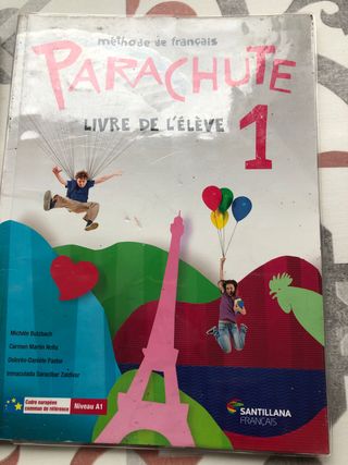 Libro de texto primero de ESO de francés Parachute 1. Editorial Santillana. ISBN : 978-84-96597-97-6. Libro de prácticas no ofertado por estar escrito.