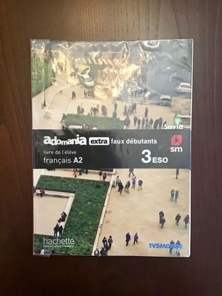 Libro de francés Adomania extra faux debutants A2 de 3º ESO. En perfecto estado, solo tenía unas páginas escritas en lápiz y ya están borradas. Dos paginas del final escritas con bolígrafo, pongo las fotos.
