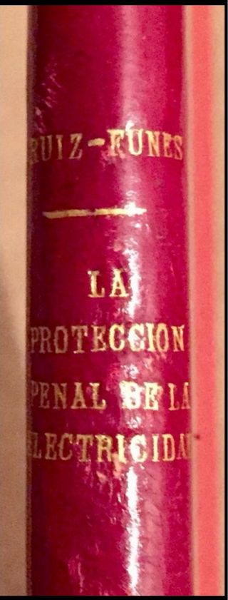 LA PROTECCIÓN PENAL DE LA ELECTRICIDAD. Mario Ruiz Funes. Librería General de Victoriano Suárez, Madrid, 1926. 1ª edición. Mediapiel y cartoné. 75 pgs. 18x12 cm. Muy raro. Naturaleza jurídica de la electricidad, sustracción de electricidad, estafa, daño, hurto, hurto de uso, legislaciones y jurisprudencias extranjeras, españolas, bibliografía. (Derecho ley juzgado abogado juez judicatura código penal civil legislación ciencia técnica electrotecnia).