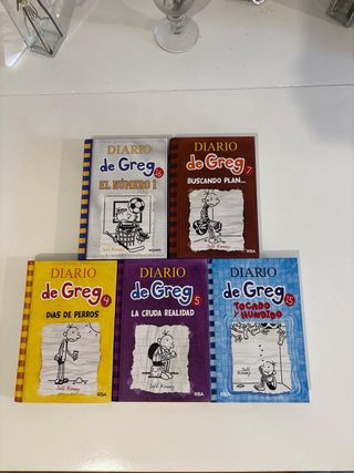 Llévate estos 5 libros del Diarlo de Greg. -La cruda realidad -Días de perros -Tocado y hundido -El número 1 -Buscando Plan Los libros del diario de greg son la manera perfecta de que tu hijo/a lea sin parar y no se aburra en ningún momento. Yo te vendo 5! Estos libros son entretenidos con unas historias interesantes. los peques se lo devoran. Con unos dibujos que acompañan la historia, un lenguaje y letra atractivas para ellos. Te digo que es la mejor opción fomentar la lectura! Cada libro nuevo te sale por 15€ es decir que esta colección serían 75€. Te la puedes llevar por 30€ y ahorra más de la mitad. Por unidad sería 7,5€