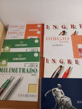 Se vende material por cese de estudios.El lote está compuesto por: -1 bloc de dibujo Senator con 19hojas de 32,5cm. × 23cm. -1 carpeta con 8 hojas milimetradas 21 ×29,7cm. -2 carpetas de hojas vegetal 21 × 29,7cm.a una solo le le faltan 3 hojas de las 12 que llevan. -2 carpetas de 10 hojas cada una de 22× 29,7cm. -1 bloc de 18 hojas guarro de 32,5 × 23cm. -1 bloc de 29 hojas guarro de la 32,5×46 cm. -1 carpeta con 10 hojas 29,7 ×42cm. Todo el lote por solo 15€.