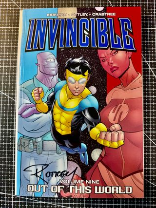 Vendo comic USA Invincible Vol. 9: Out of This World TPB (Image Comics). Incluye los números #42–47 de la serie creada por Robert Kirkman con dibujo de Ryan Ottley. Ejemplar firmado por Ryan Ottley en portada. Incluye Certificate of Authenticity (COA) que certifica la firma. Ideal para coleccionistas de Invincible o para fans de la serie. - Idioma: Inglés, 144 páginas - Edición en tapa blanda (TPB) en muy buen estado. Sin marcas de lectura. Buen brillo de portada. Esquinas y lomo bien conservados. Guardado en funda. Cuidado por coleccionista, se recomienda revisar las imágenes para valorar conservación.