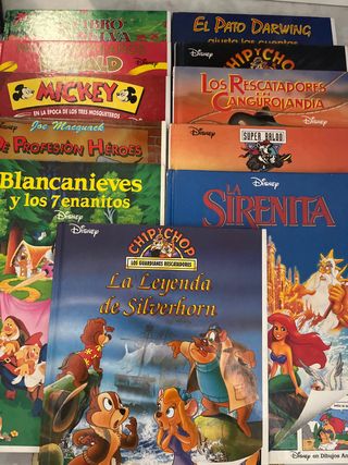 Se venden libros de Disney totalmente originales con más de 20 años. Tienen cubierta dura a la vez que blandita. se encuentran en muy buen estado, se trata de una reliquia. Disfruta con los peques o grandes de los clásicos que marcaron nuestra infancia. Se podrían adquirir por separado.