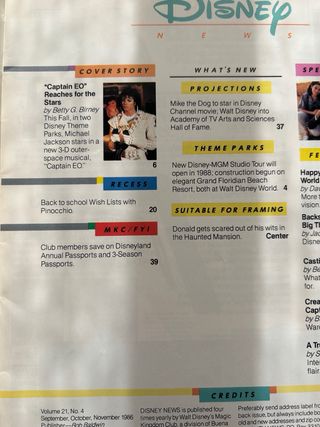 Dos pequeñas revistas distribuidas por Disney que cuentan con artículos que hacen referencia al cortometraje 3D “Captain EO” que protagonizó Michael Jackson junto a Angelica Huston, y dirigido por Francis Ford Coppola.